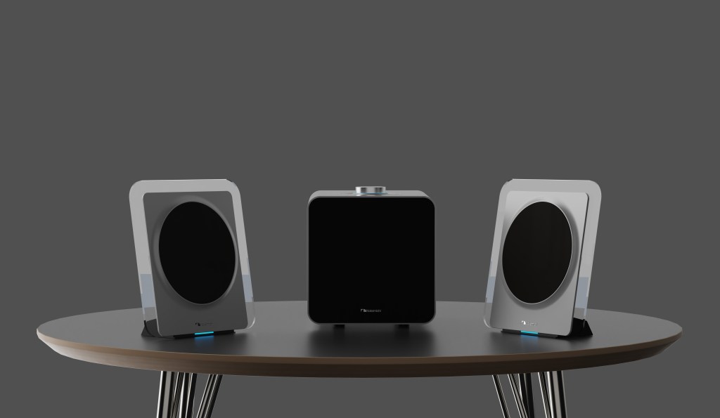 Nakamichi SOUND STATION KTYSTALはTrue Wirelessで音声信号をつなぎます。3方向にドライバーがついているCENTER SUB WOOFERにはメインコントロールユニットが入っています。TOPのボリュームダイヤルを長押ししたら、電源が入ります。入力のデフォルトはBluetoothになっています。入力はAUX, USB, 光ケーブルとの有線での接続が可能です。音声出力端子はついていません。
